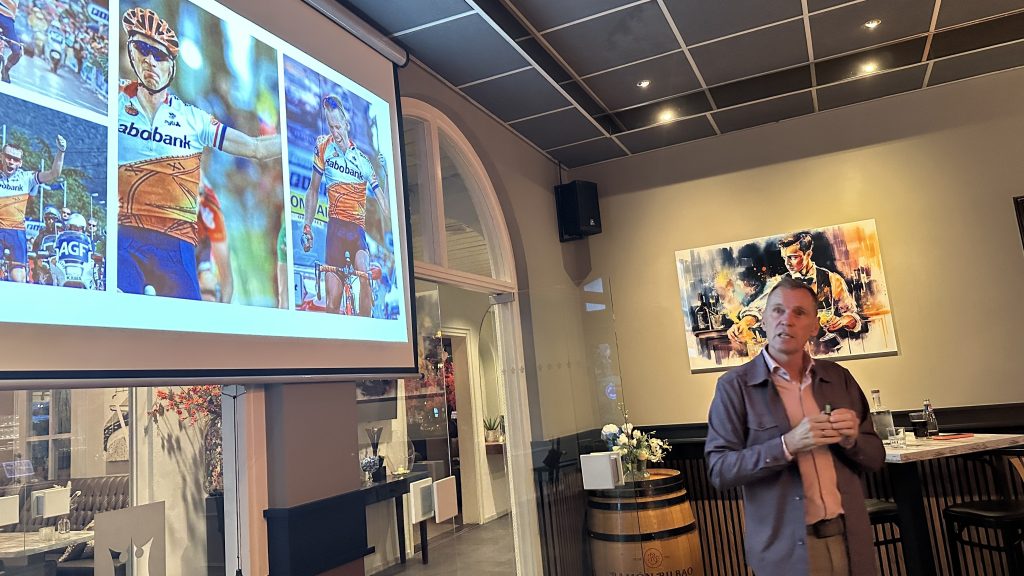 Het echte hoofdgerecht van de avond was de presentatie van oud top wielrenner Erik Dekker. Erik ontwikkelde zich van verlegen jongen tot nummer één op de wereldranglijst. Hij was knecht, kopman én coach. Hij kwam regelmatig ten val, maar richtte zich altijd weer op en kwam dan sterker terug. Met zo’n carrière heb je wat te vertellen! Mooi om te zien hoe hij de leden wist te boeien.