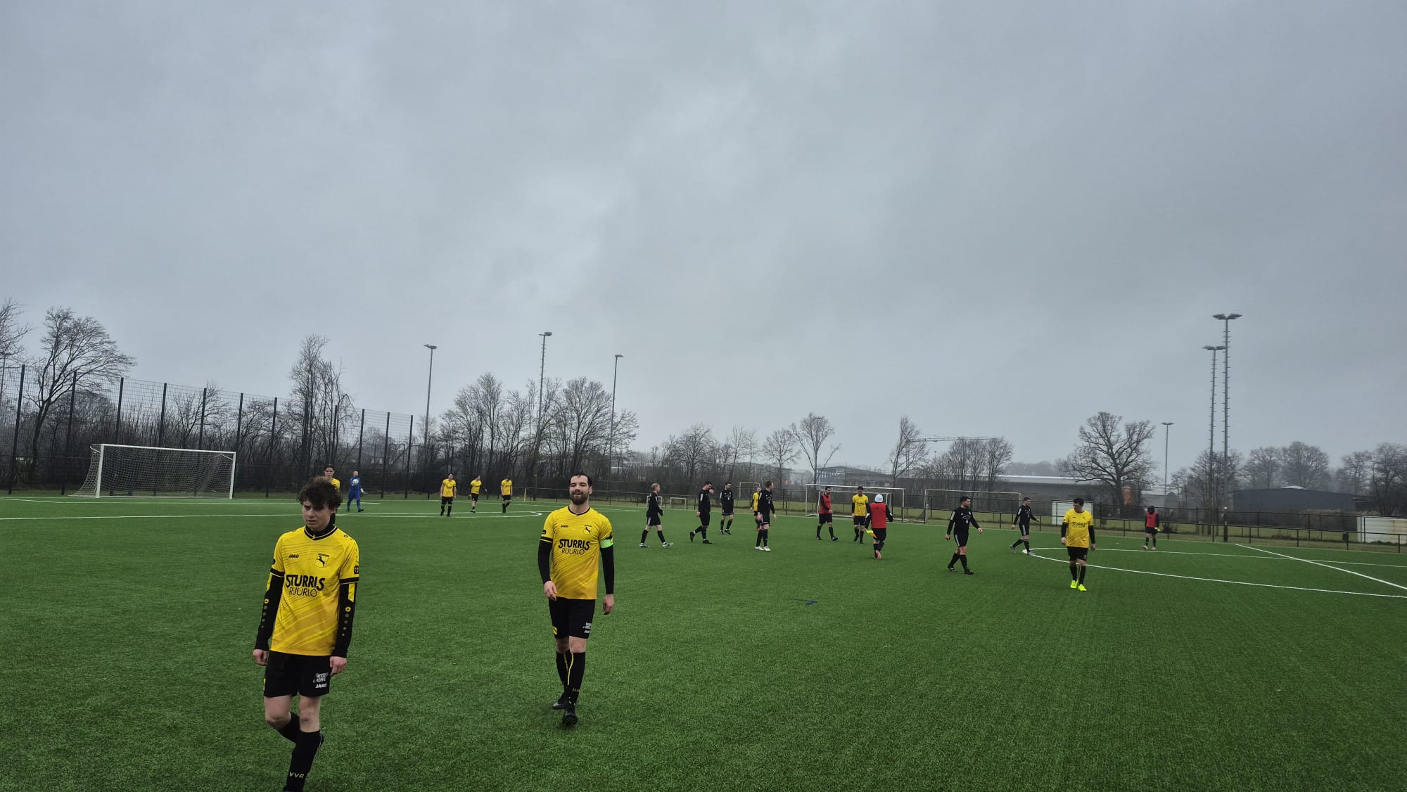 Gelukkig gingen Jaap, Lars, Naud en El Butre (Stan) mee om ons te versterken. Na een best eindje lopen kwamen we bij de kunstgrasmat. Maar die was goed in orde, En zelfs de grensrechters waren geregeld – alleen de VAR ontbrak nog. Joost mocht bij afwezigheid van Jelle M. en Jonathan de nieuwe aanvoerdersband dragen. We hoorden dat de tegenstander FC Vreden ’52 3 twee keer in de week trainden. En hun warming up zag er ook wel professioneel uit. Vreden begon fel en kreeg al snel de eerste kans, maar Jelle redde uitstekend. Tim en Bram zaten er kort op en hielden de boel compact. Lucas viel geblesseerd uit en daardoor maakte Naud zijn debuut. Hij voelde zich al aardig thuis bij ons en wilde iemand aardig onderuit halen maar dat lukte gelukkig niet. Hij kreeg wel een vermaning van de scheidsrechter.